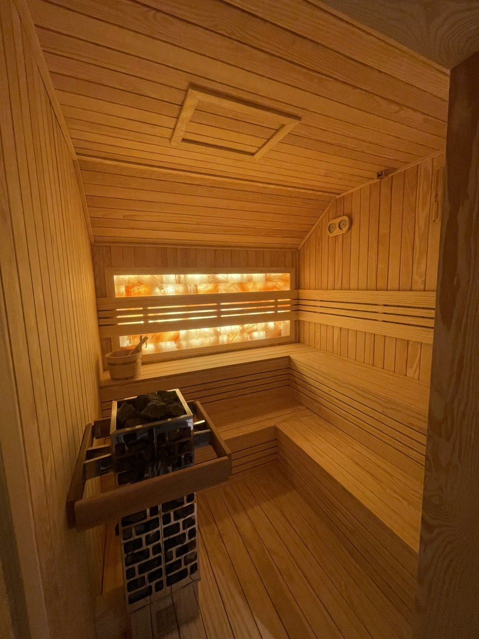 – Thiết kế được xây tường xung quanh tạo không gian riêng biệt cho phòng xông. Vách tường sử dụng gỗ Hemlock tự nhiên bề mặt nhẵn mịn, không mắt, an toàn cho sức khỏe con người, chịu được nhiệt độ cao. Đá muối Himalaya được ghép trên vách sau. Diện tích ốp đá muối hài hòa với kích thước phòng xông