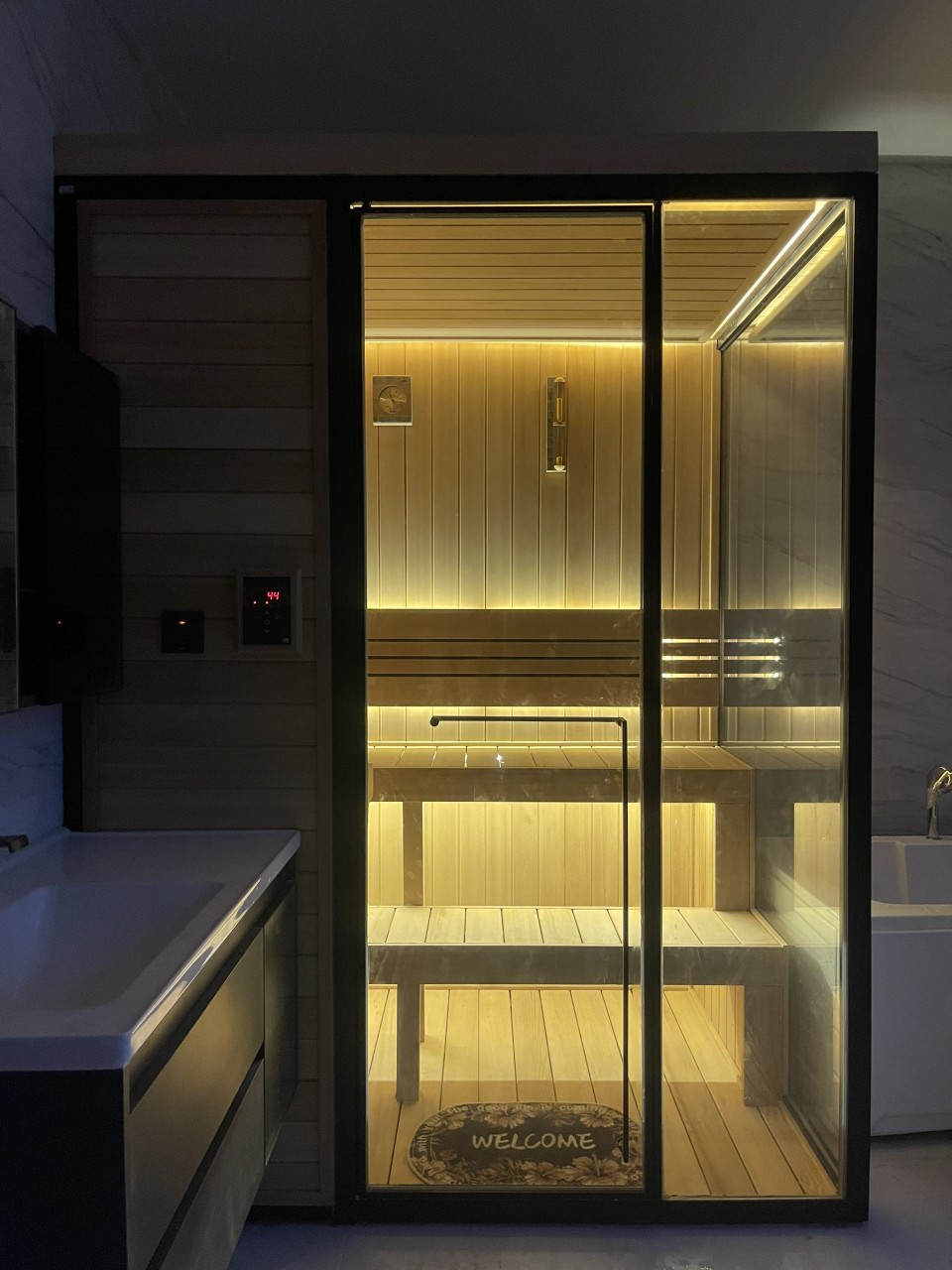 Sự kết hợp hoàn hảo giữa chất liệu kính cường lực cao cấp và gỗ Hiniki cao cấp tạo nên kiểu phòng xông hơi sang trọng, đẹp mắt, tinh tế và vô cùng hiện đại.