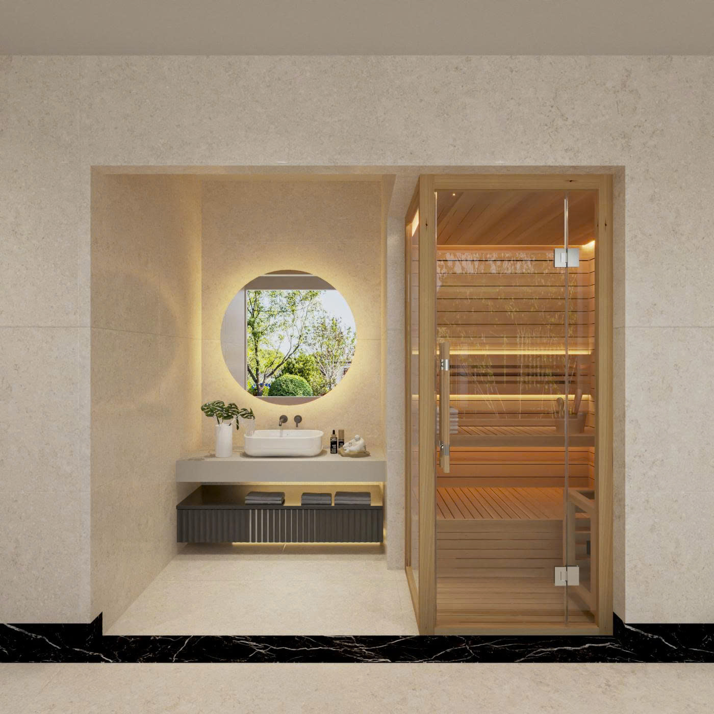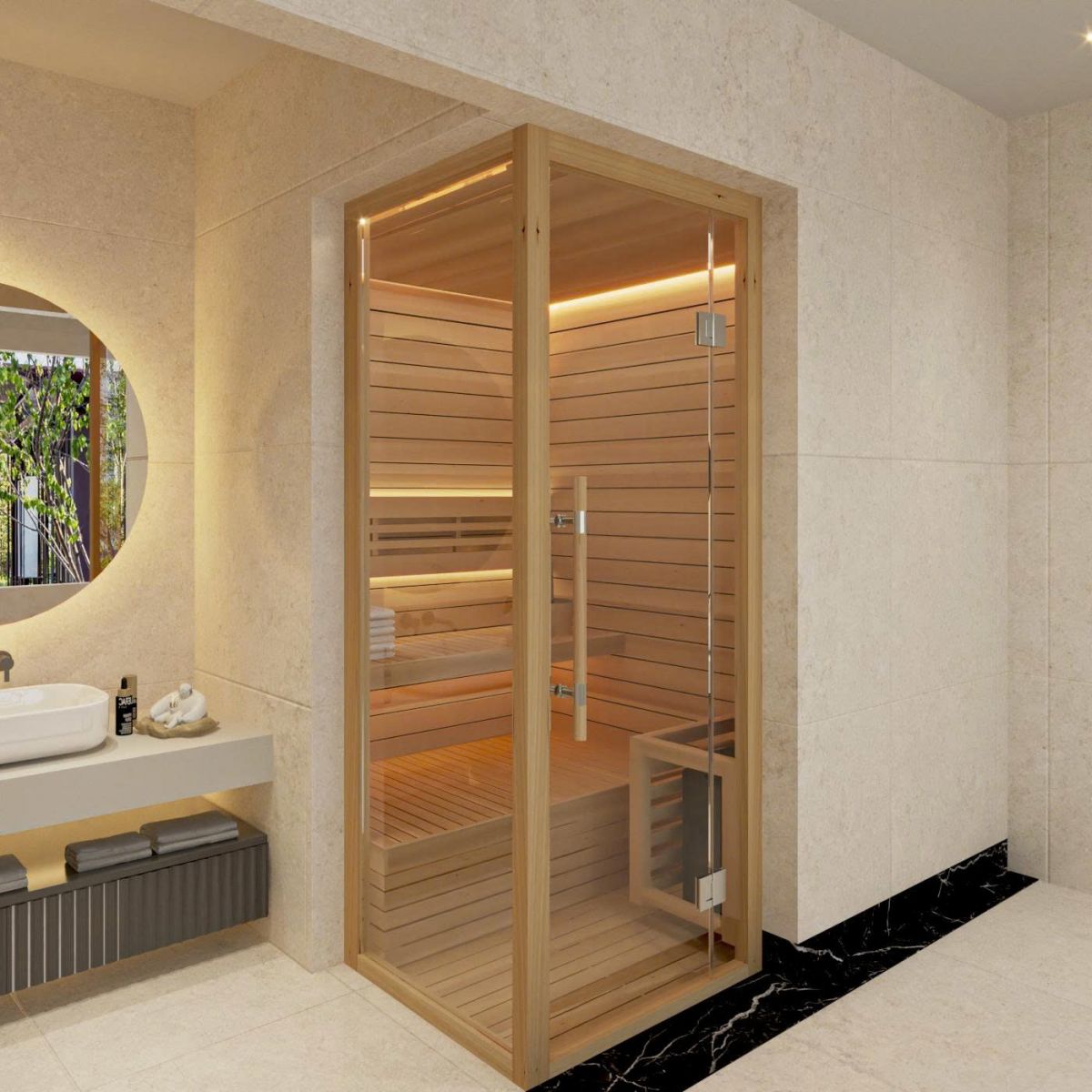 Sự kết hợp hoàn hảo giữa chất liệu kính cường lực cao cấp và gỗ Tuyết Tùng Canadacao cấp tạo nên kiểu phòng xông hơi sang trọng, đẹp mắt, tinh tế và vô cùng hiện đại.